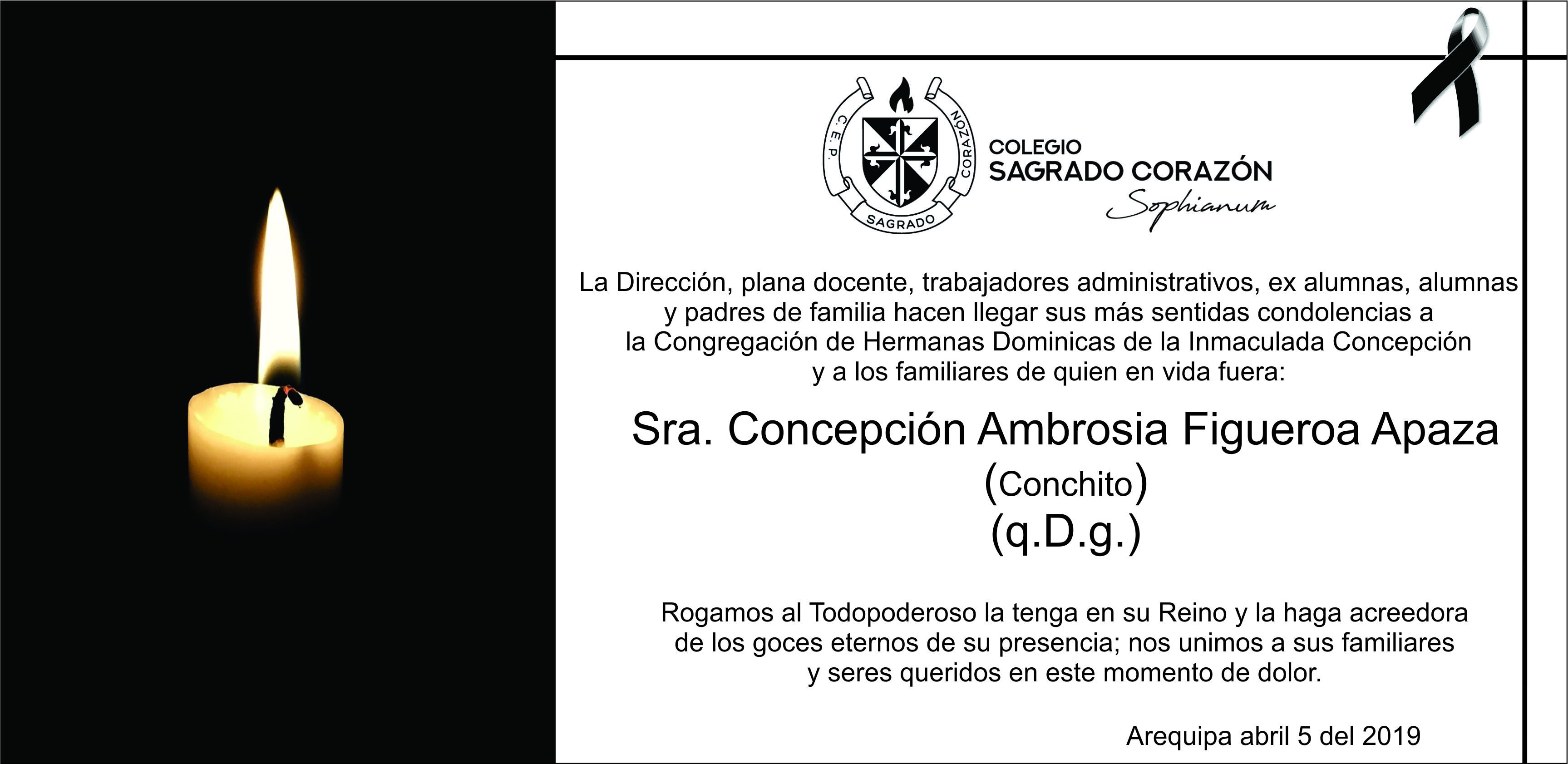 Rogamos por el descanso eterno de quien en vida fuese Sra. Concepción Ambrosia Figueroa Apaza (Conchito), destacada y muy querida ex trabajadora de nuestra Institución.