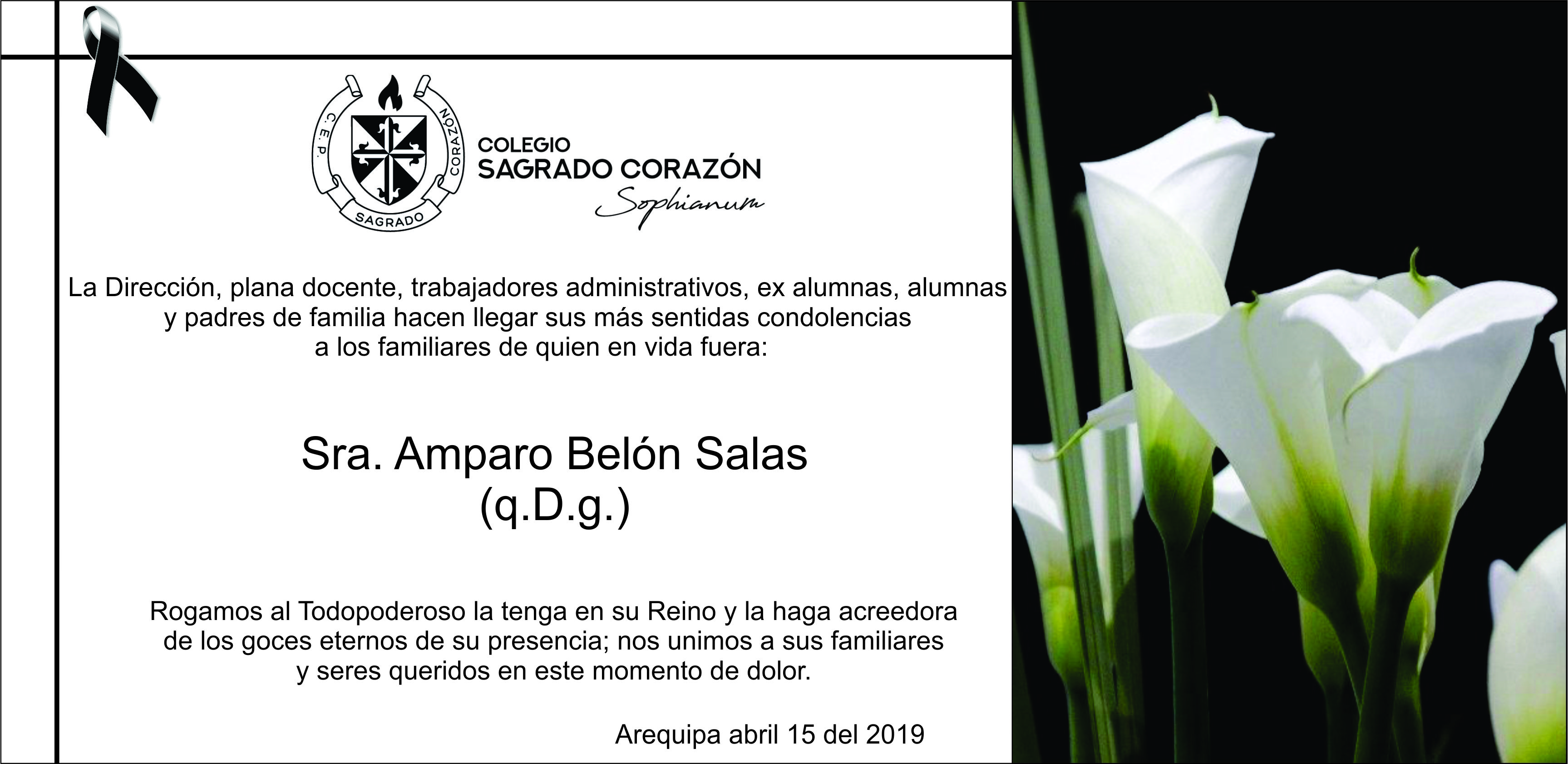 Rogamos por el descanso eterno de quien en vida fuese Sra. Amparo Belón Salas, ex docente de nuestra Institución. Dios la tenga en su gloria. Deja un comentario / Uncategorized / Por admin